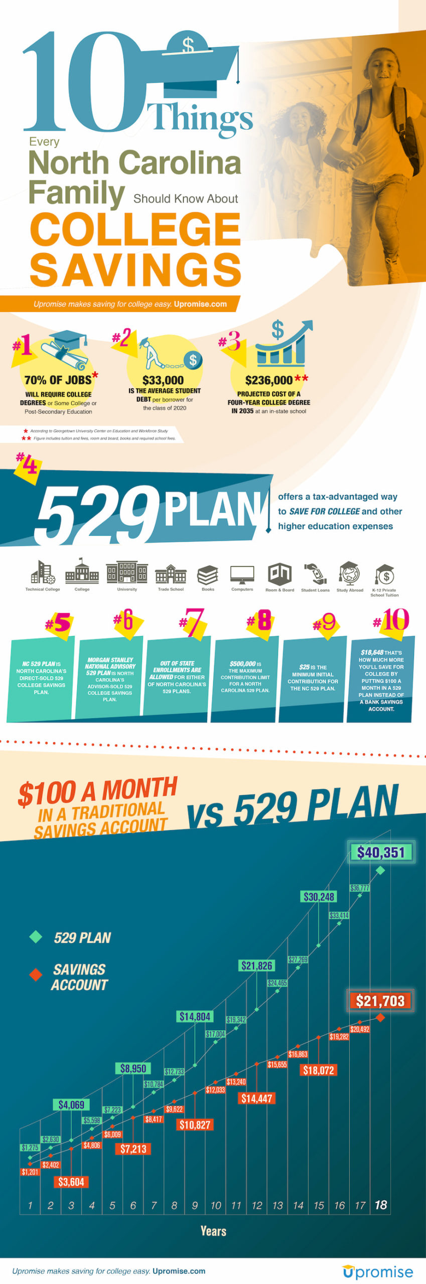 North Carolina 529 plans are eligible to be linked to the free Upromise Rewards program. Across the country, Upromise has helped families save over $1 Billion for their children’s college. Join free and earn cash for your child’s college. Additionally, every month 5 Upromise members win a free $529 scholarship.